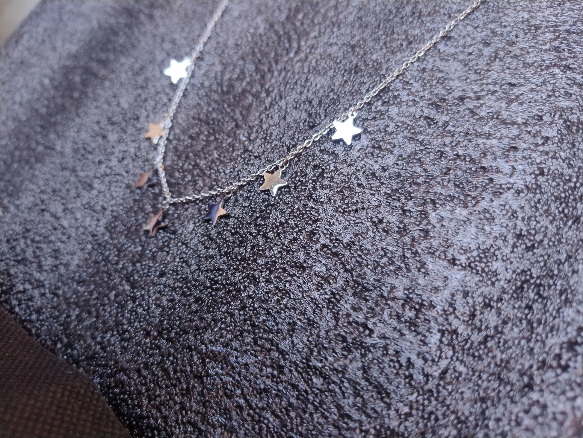 I sei charm a forma di stella donano luce e movimento, rendendola perfetta da indossare da sola o abbinata ad altre collane per un effetto multistrato.