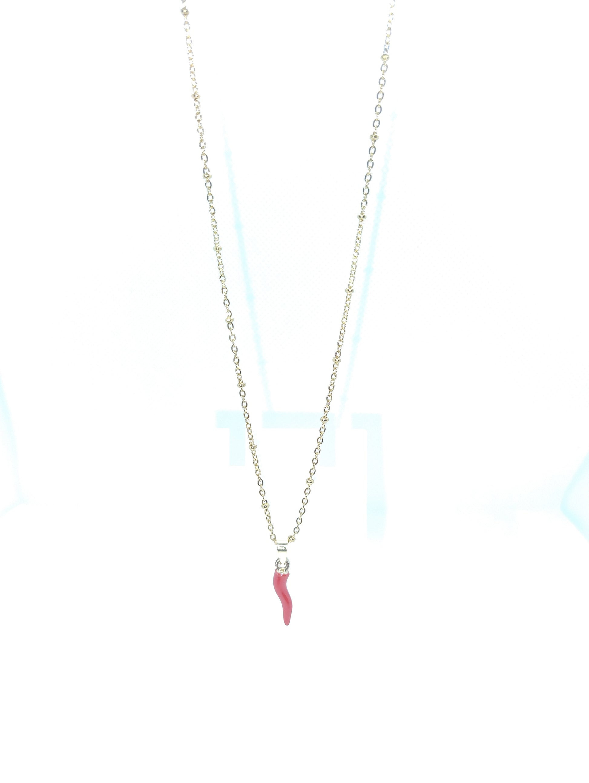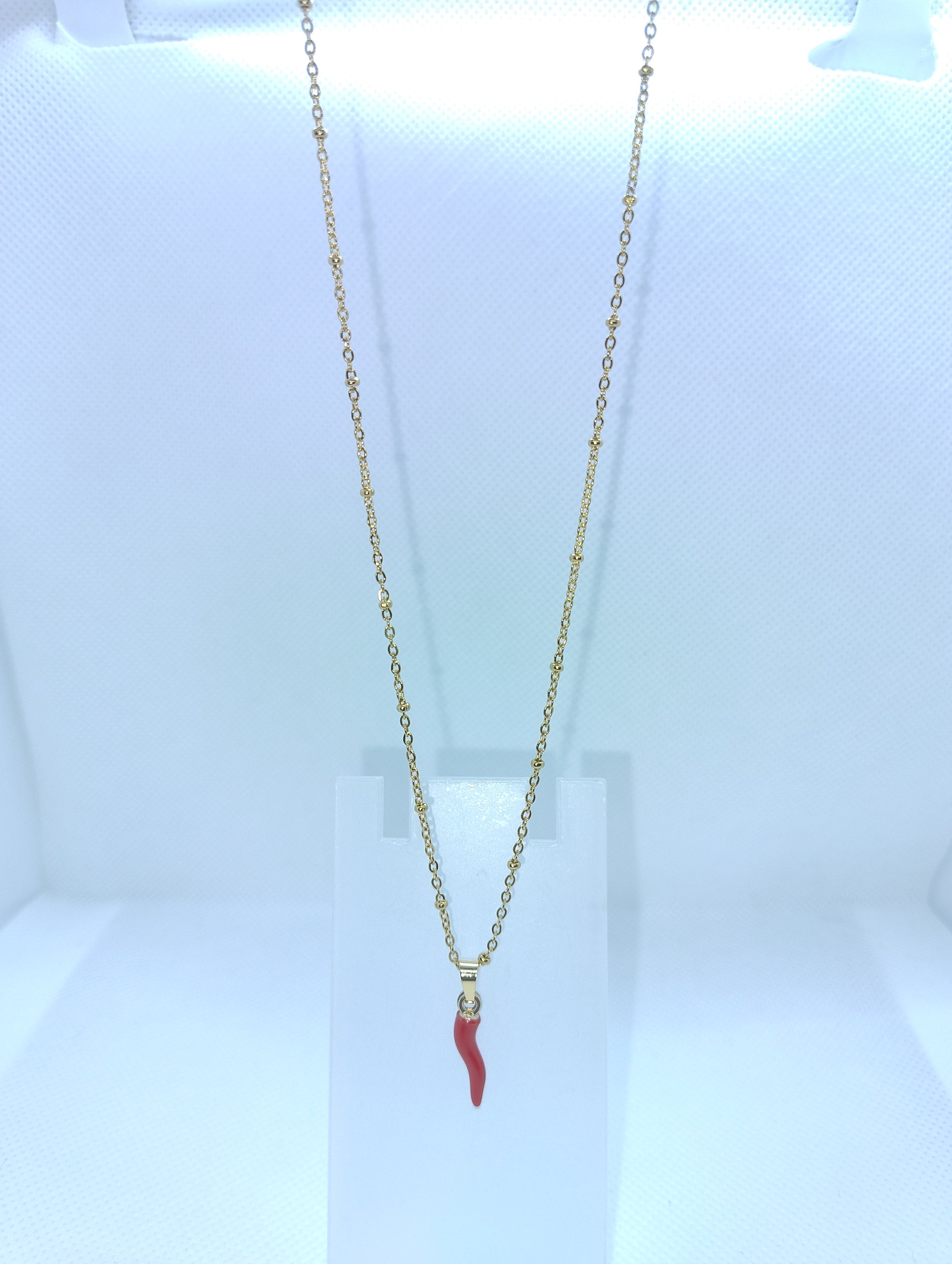 Porta con te un simbolo di protezione e fortuna con questa elegante collana in acciaio inossidabile (S. Steel). Il ciondolo a forma di corno rosso, noto come "cornicello" napoletano, è un amuleto tradizionale che, secondo la credenza popolare, allontana il malocchio e attira energia positiva. Perfetta per chi ama la tradizione con un tocco di stile moderno, questa collana è ideale per un regalo speciale o per proteggerti con classe ogni giorno.