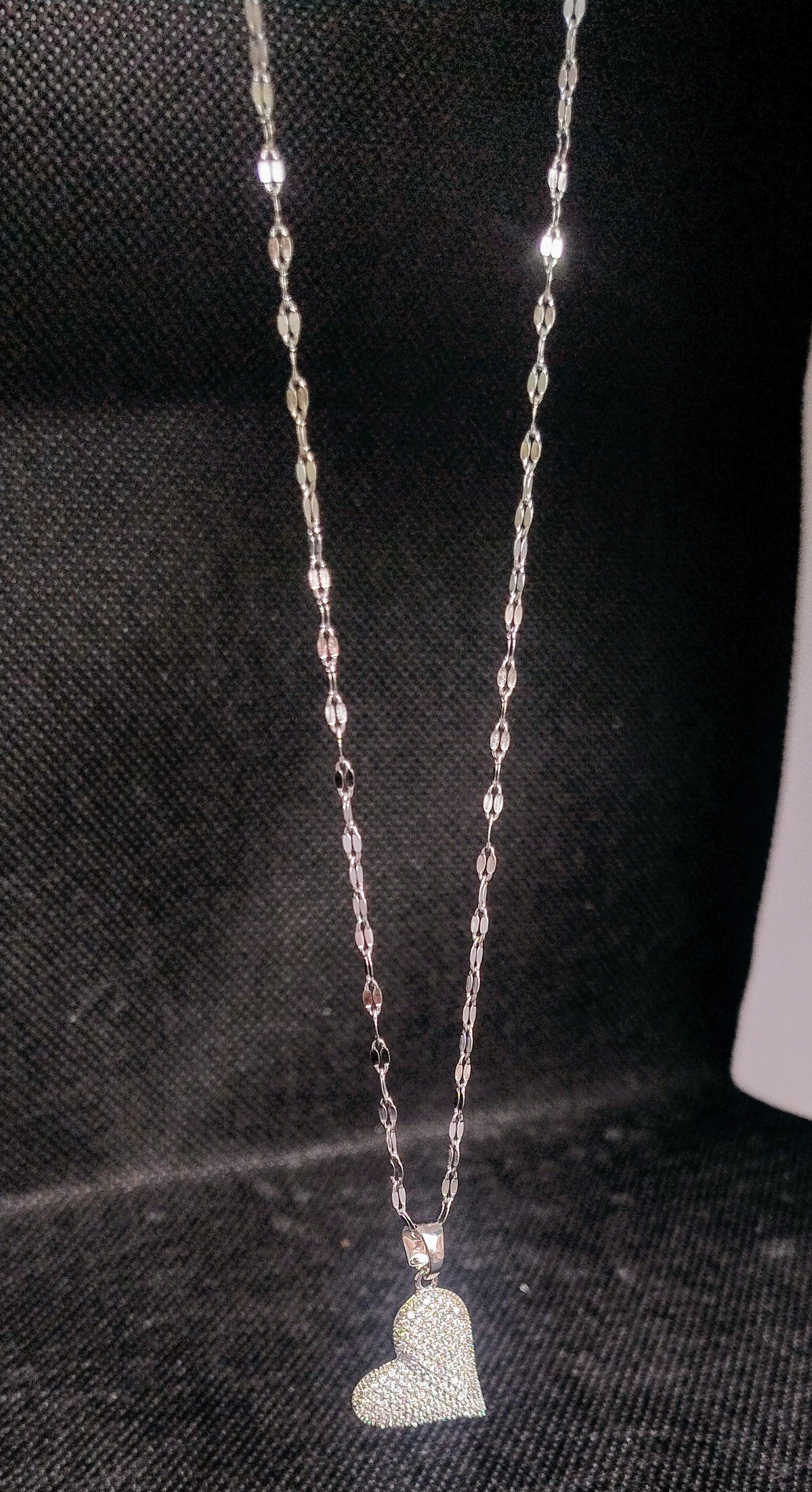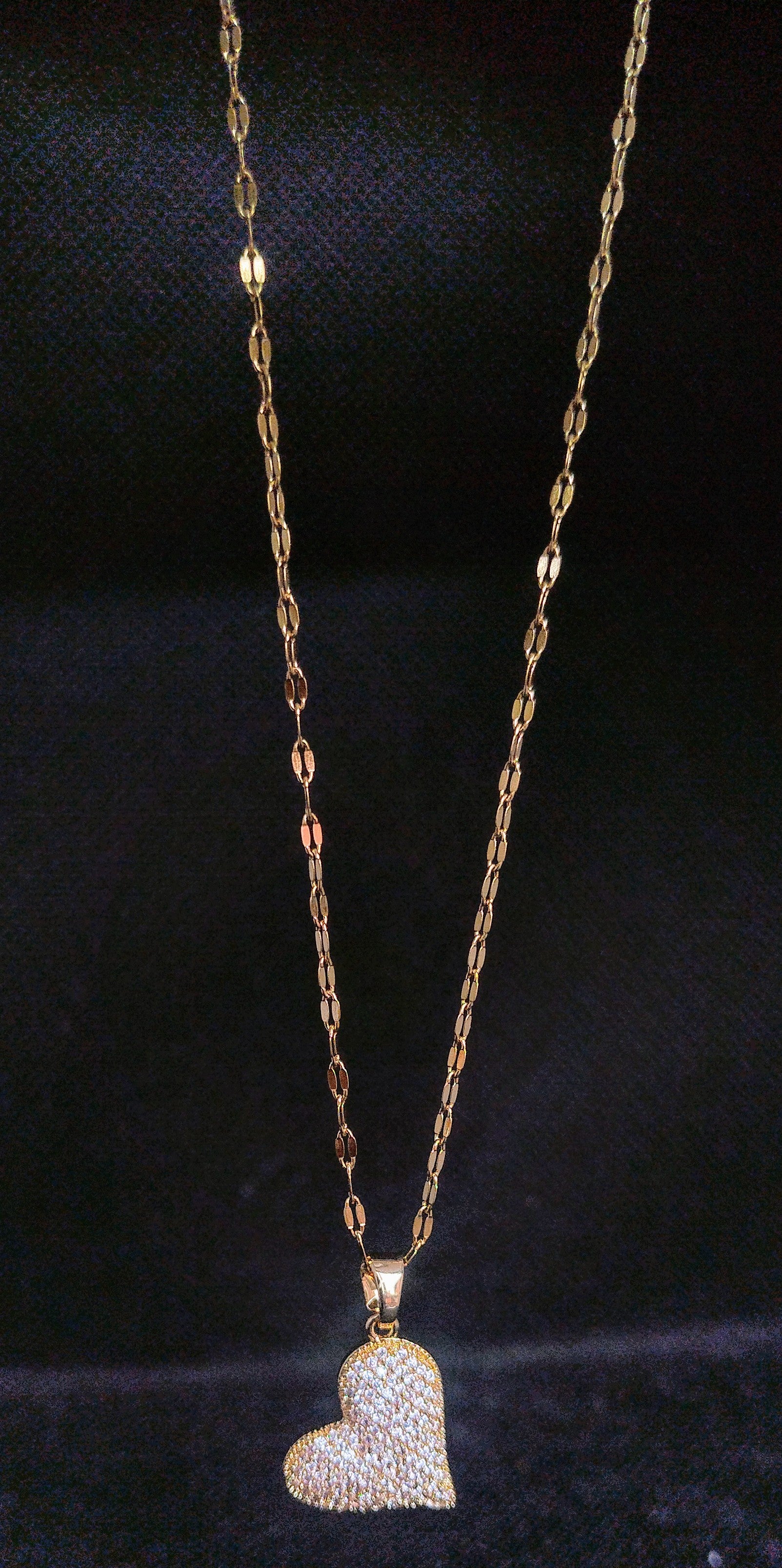 Collana con pendente a cuore bombato interamente decorato da microstrass luminosi. Disponibile in due varianti colore, un accessorio elegante e scintillante per ogni occasione.