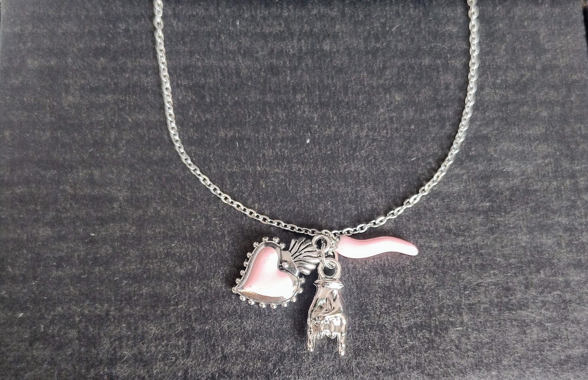 Collana in acciaio inox e metallo con charms portafortuna: cornicello, mano che fa le corna e cuore.