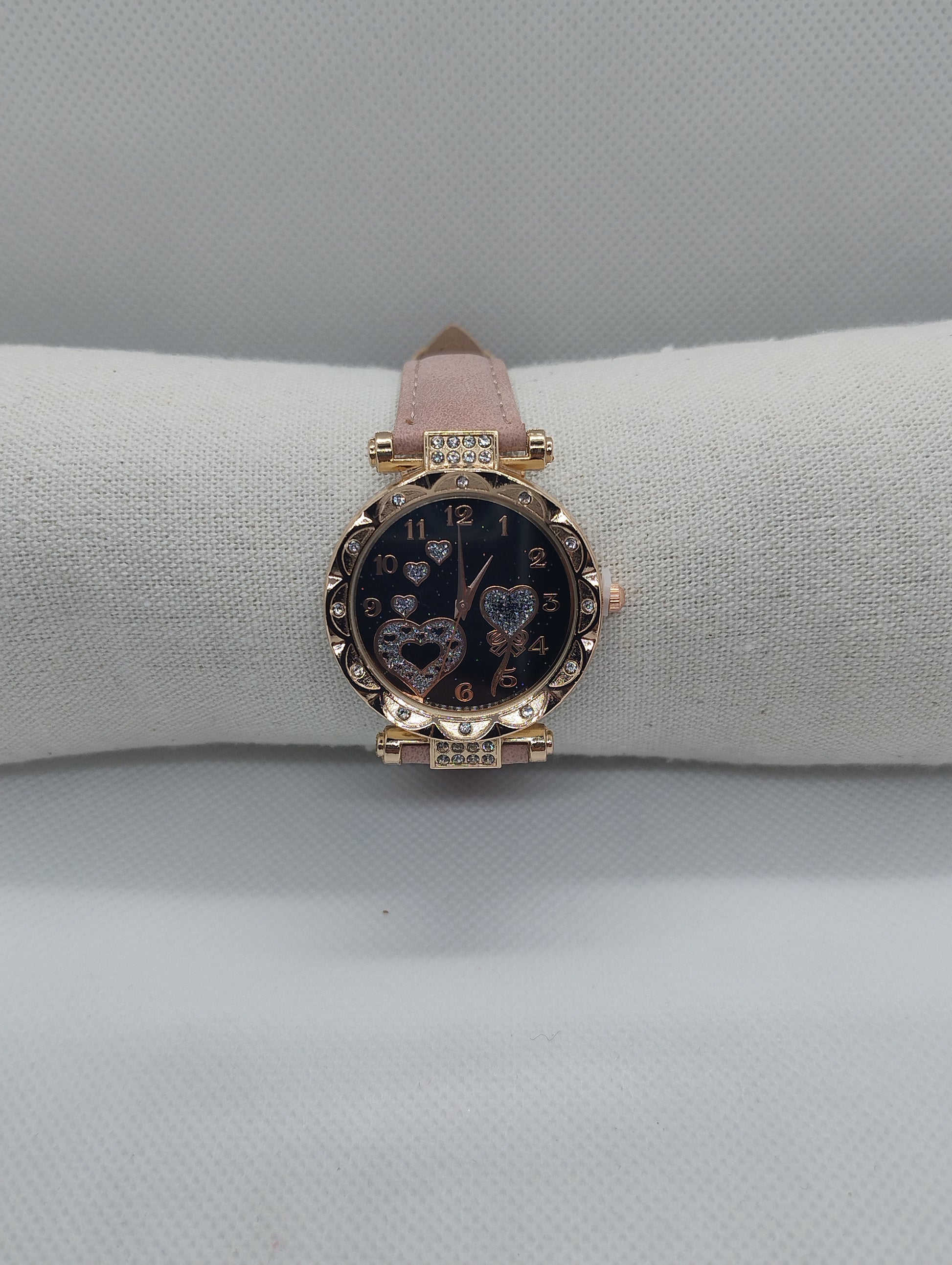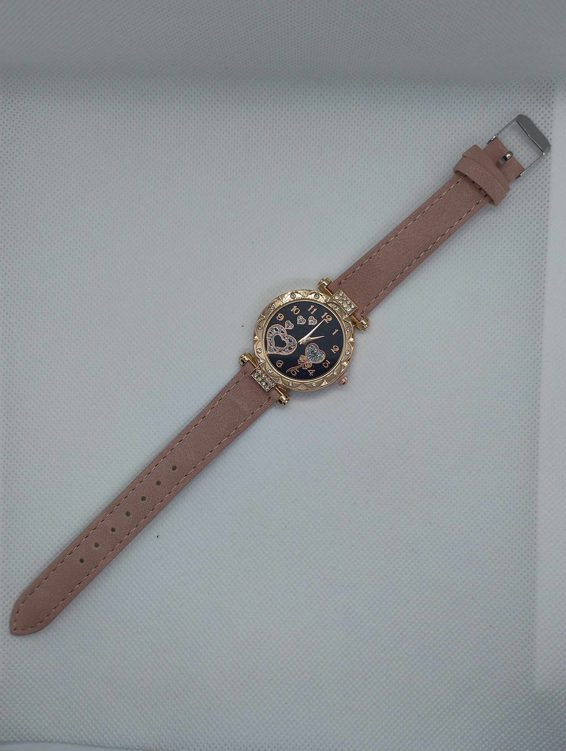 Un orologio che unisce classe e romanticismo, perfetto per chi ama i dettagli raffinati. Il quadrante nero, impreziosito da cuori scintillanti, si abbina alla cassa dorata per un look sofisticato. Il cinturino rosa in pelle sintetica assicura comfort ed eleganza in ogni occasione.