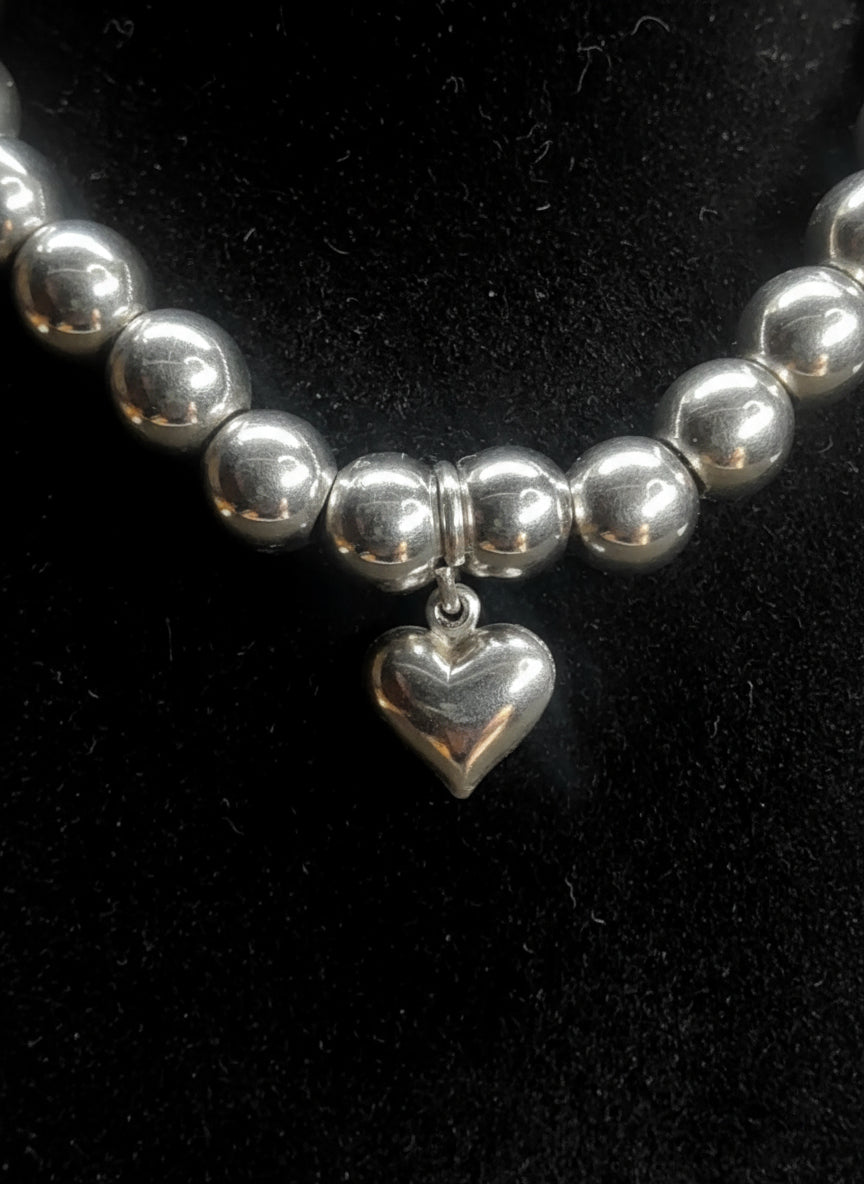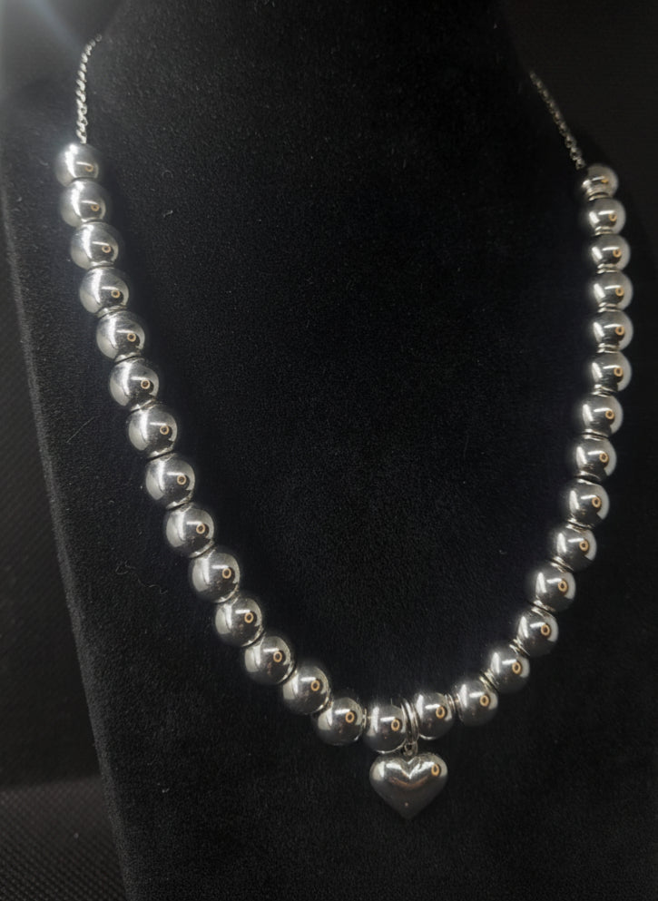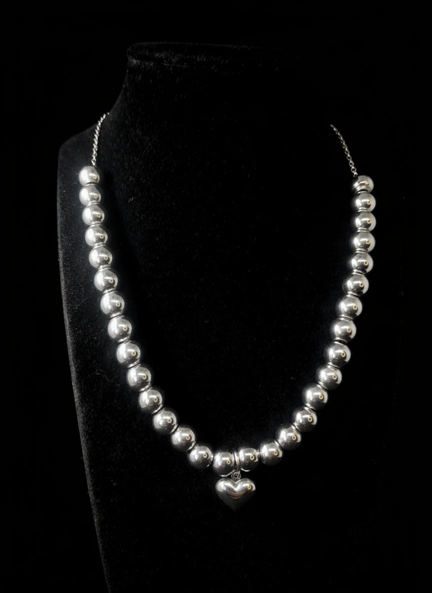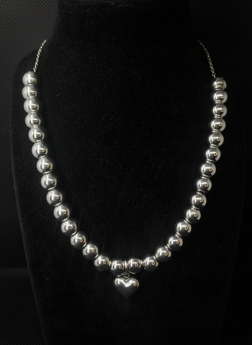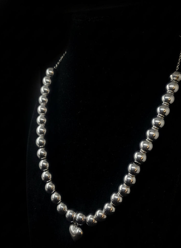 Mariagrazia è un girocollo realizzato a mano in acciaio inox con 30 sfere e un delicato cuoricino in acciaio inox.