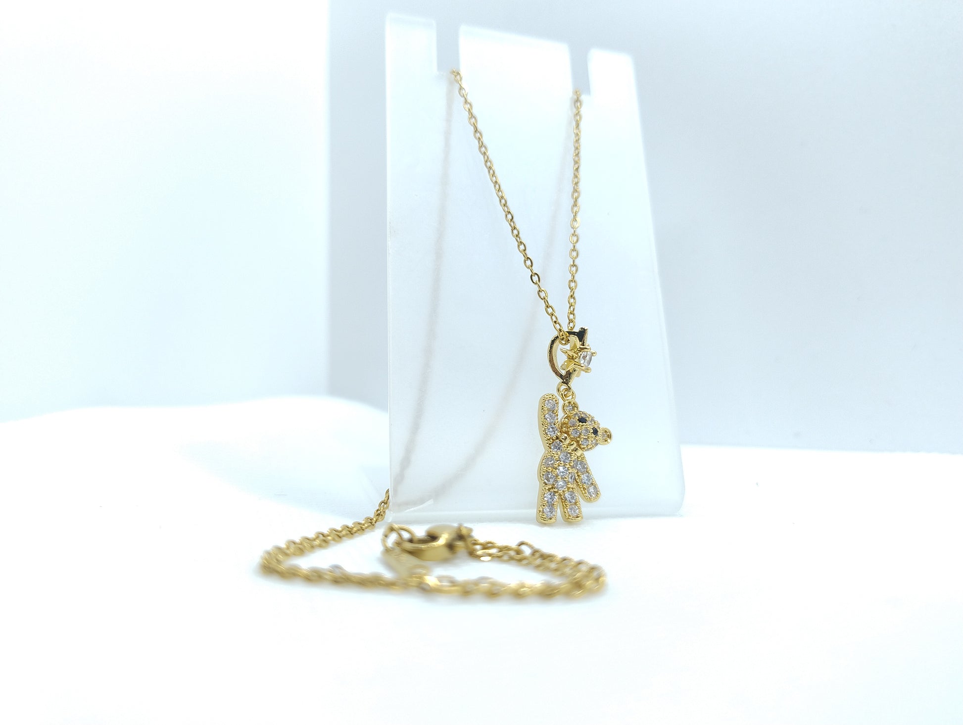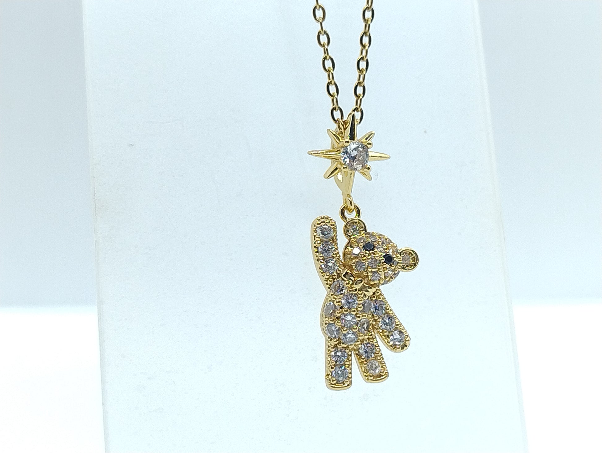 Un tenero orsetto tempestato di zirconia cubica che sembra aggrapparsi a una stella scintillante. Un gioiello raffinato e dolce, perfetto per chi ama portare con sé un simbolo di affetto e luminosità.