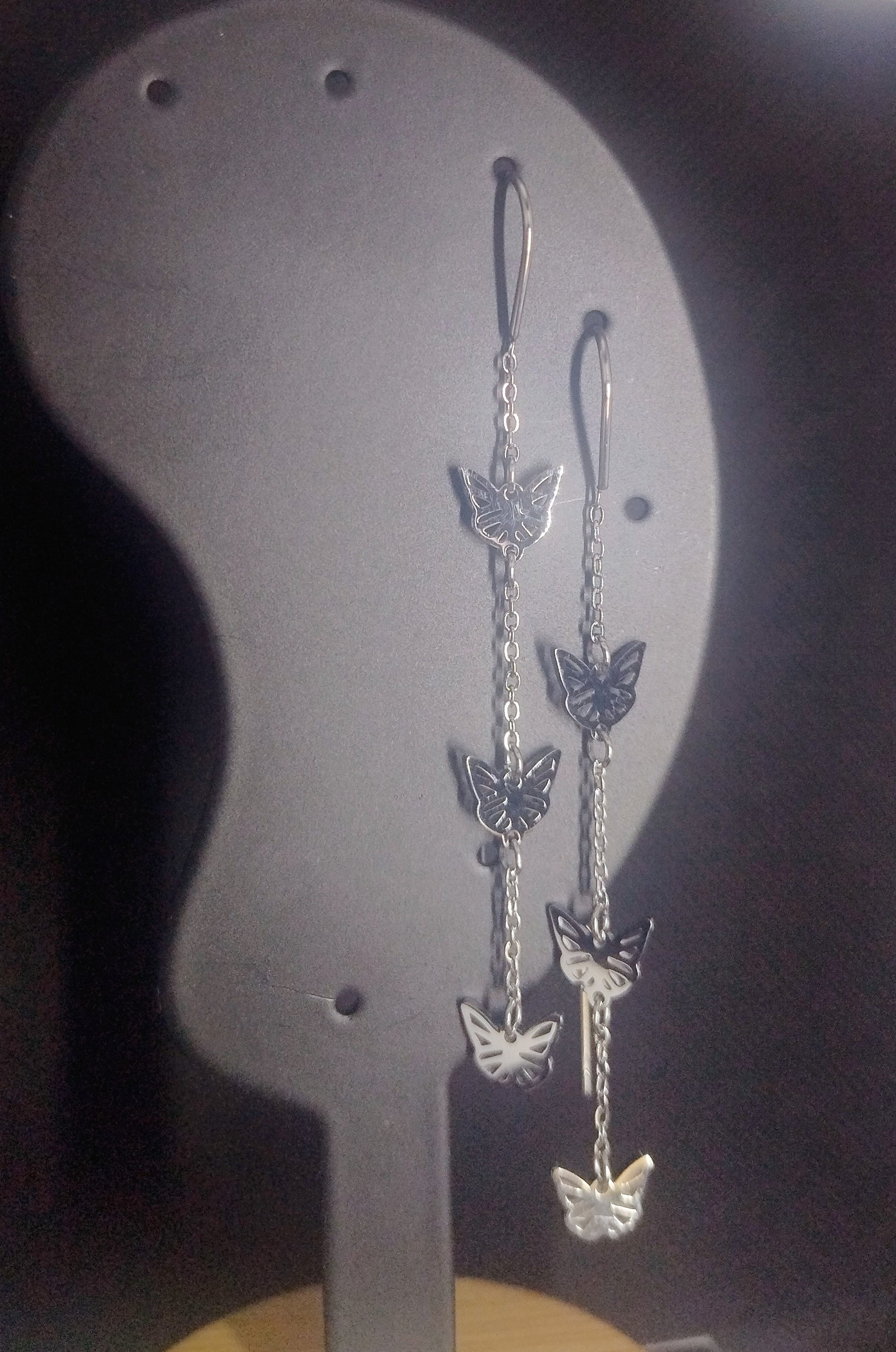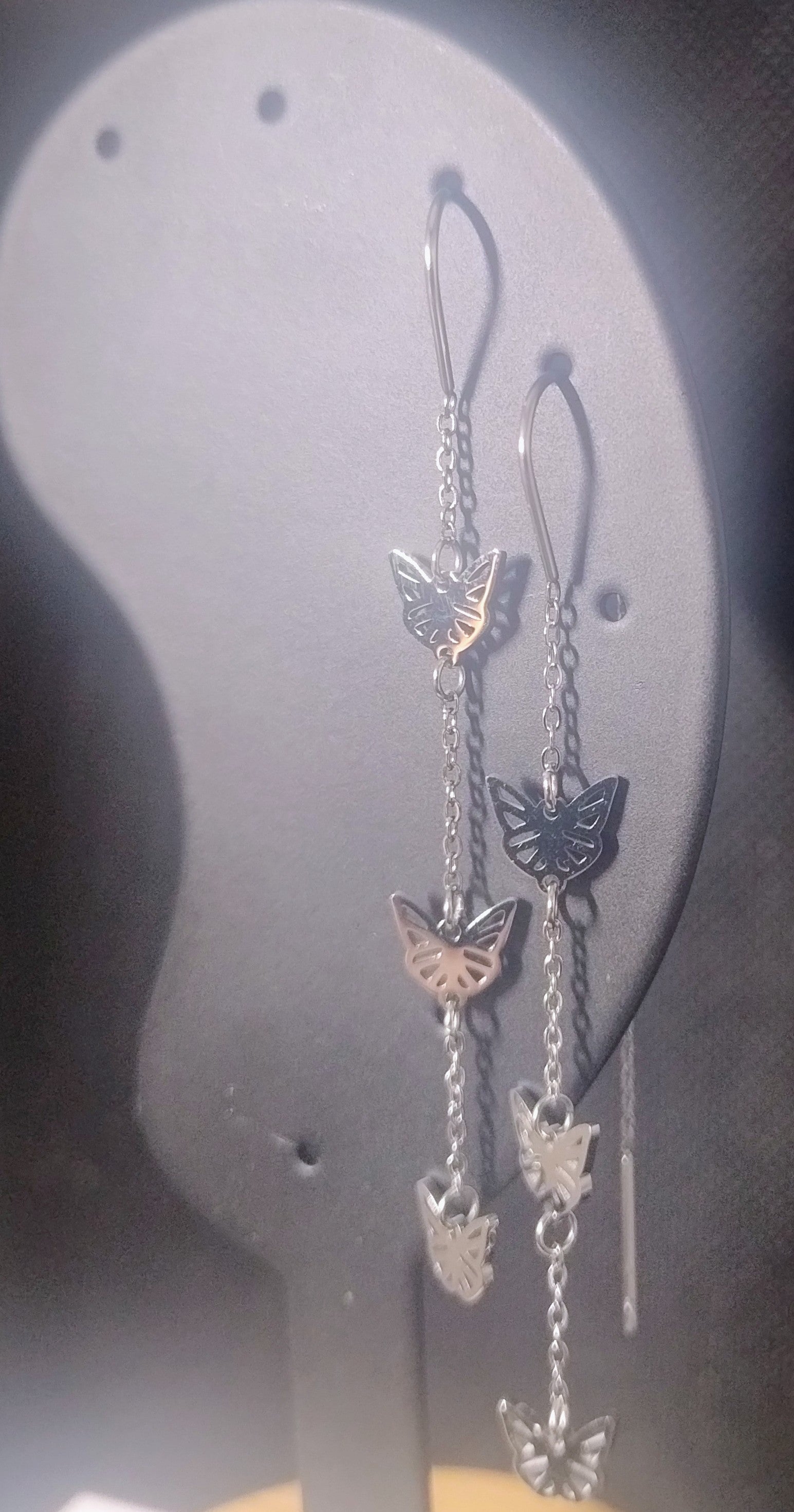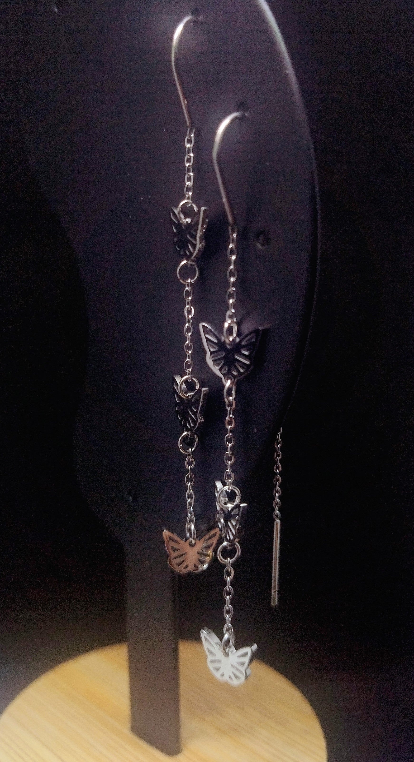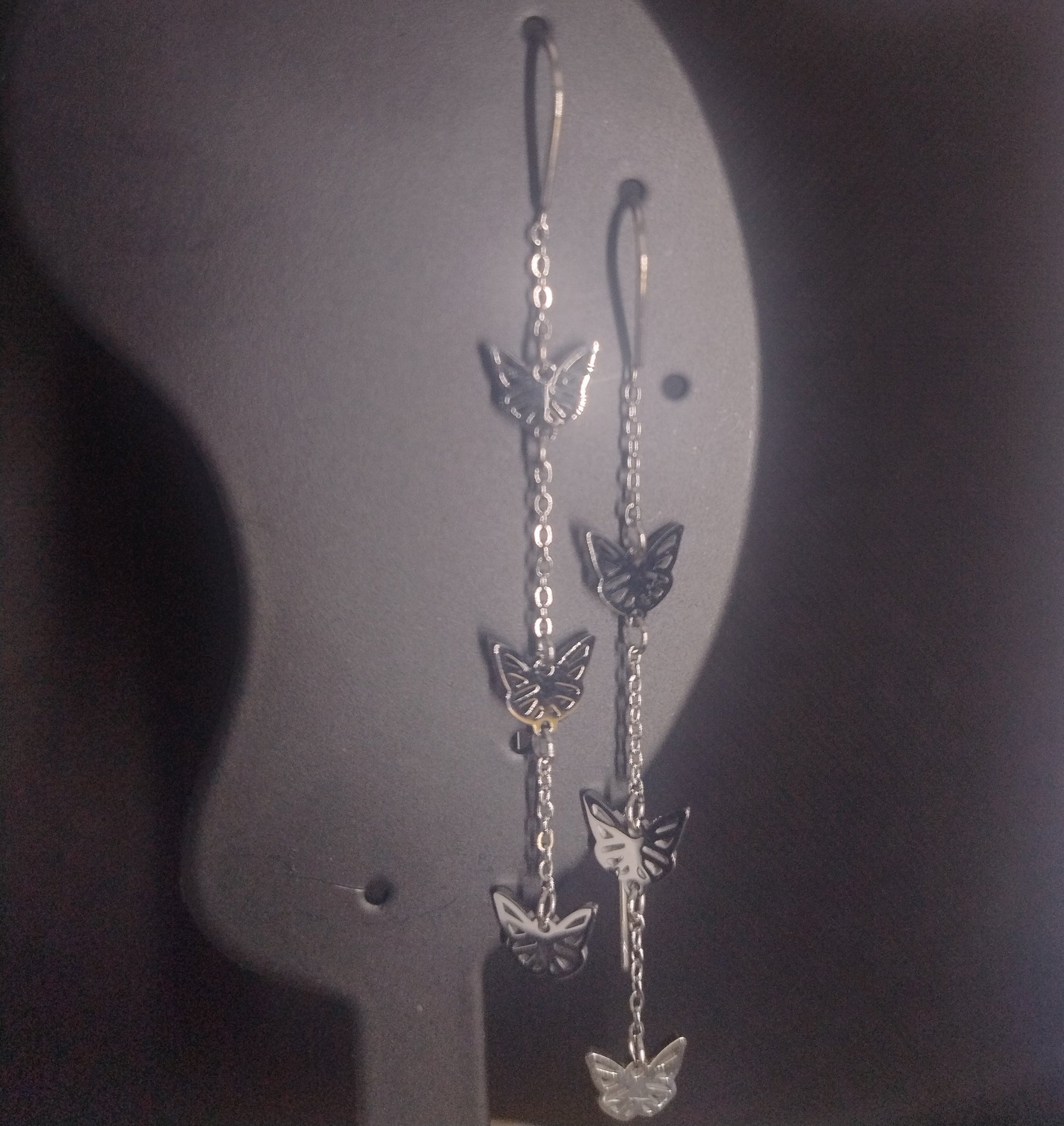 Eleganti orecchini pendenti con farfalla, realizzati in acciaio inox di alta qualità. Leggeri e confortevoli, aggiungono un tocco delicato e luminoso a qualsiasi look.