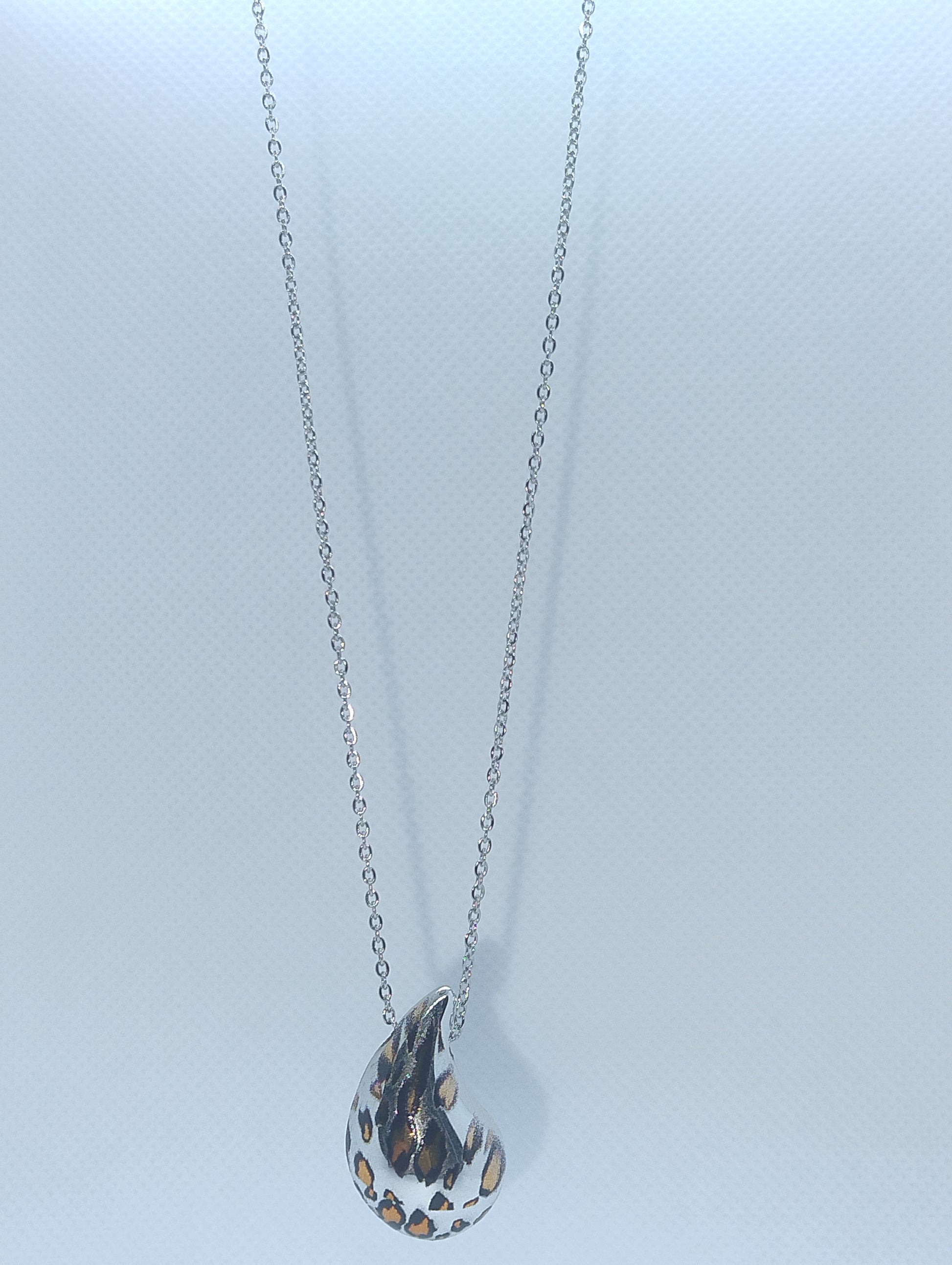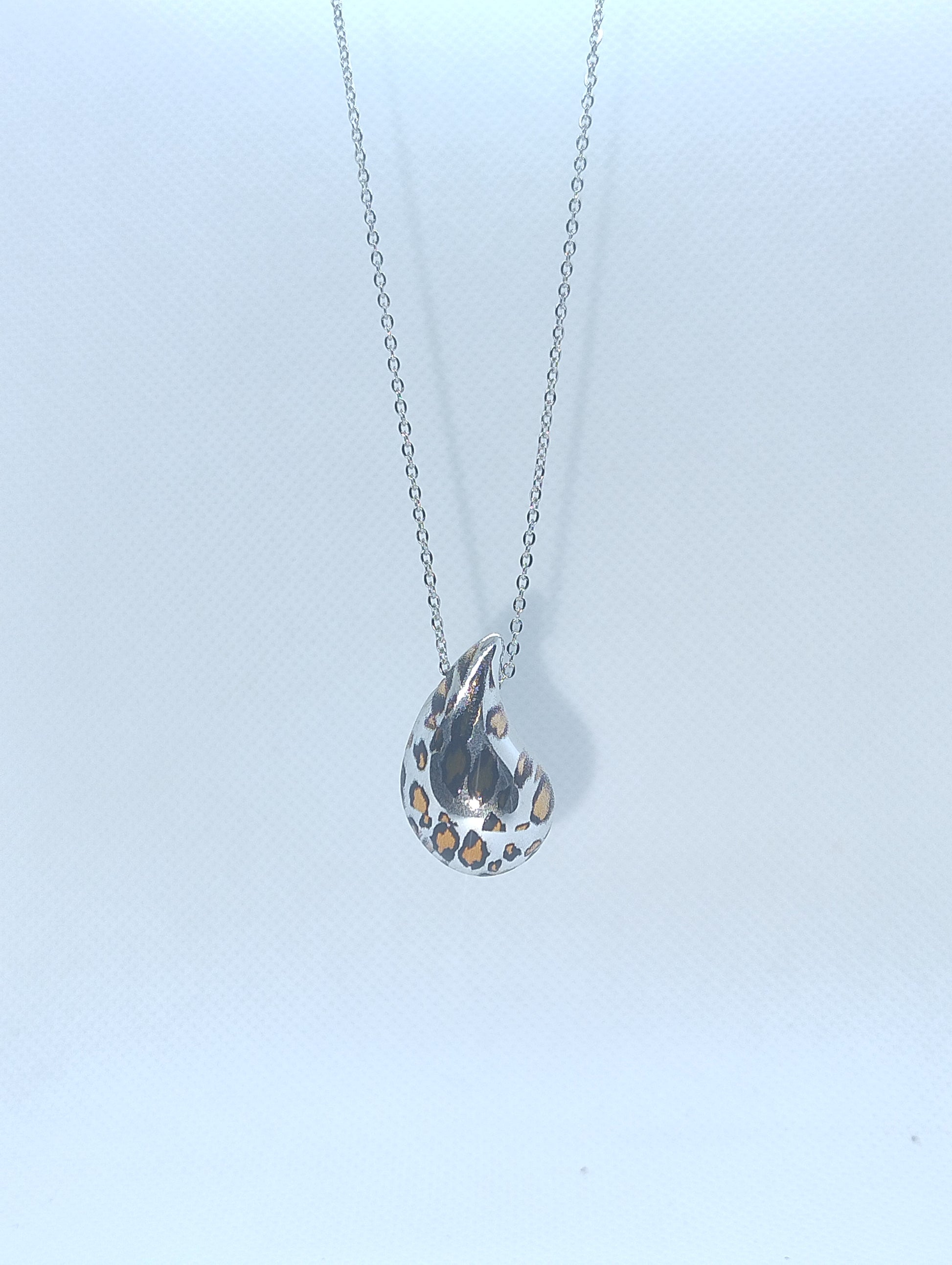 Un accessorio che incarna eleganza e spirito selvaggio. La collana "Wild Drop" unisce la purezza della forma a goccia con un audace pattern maculato, perfetto per chi ama distinguersi con classe.